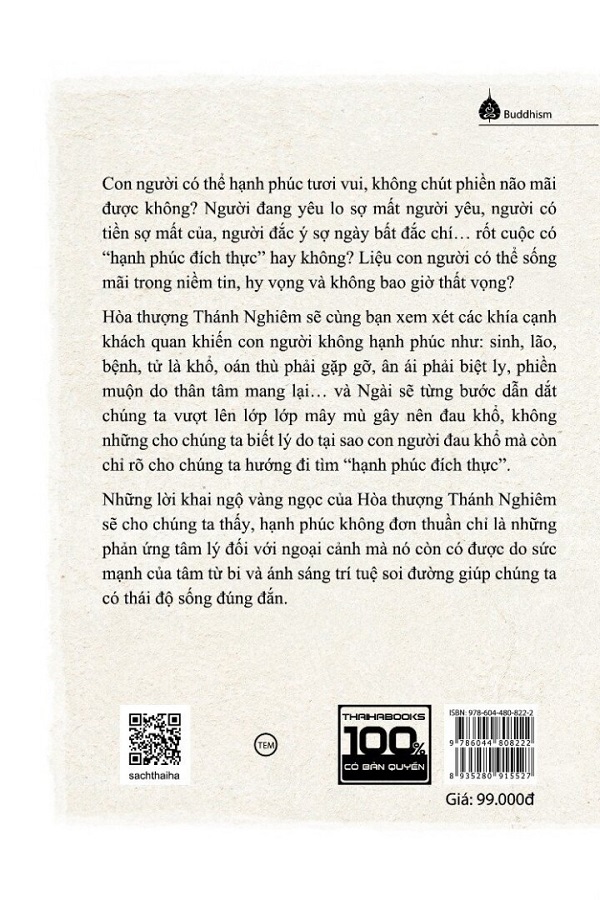 Hòa thượng Thánh Nghiêm sẽ cùng bạn xem xét các khía cạnh khách quan khiến con người không được hạnh phúc như: sinh, lão, bệnh, tử là khổ, oán thù phải gặp gỡ, ân ái phải biệt li, phiền muộn do thân tâm mang lại… và ngài sẽ từng bước dẫn dắt chúng ta vượt lên lớp lớp mây mù gây nên đau khổ, không những cho chúng ta biết lí do tại sao con người đau khổ mà còn chỉ rõ cho chúng ta hướng đi tìm “hạnh phúc đích thực”.