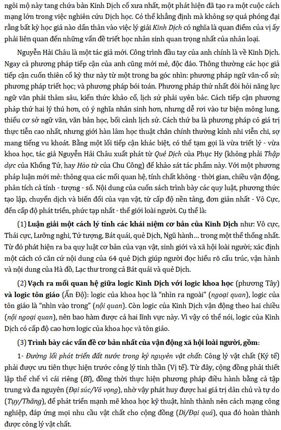 Nguyễn Hải Châu là một tác giả mới. Công trình đầu tay của anh chính là về Kinh Dịch. Ngay cả phương pháp tiếp cận của anh cũng mới mẻ, độc đáo. Thông thường các học giả tiếp cận cuốn thiên cổ kỳ thư này từ một trong ba góc nhìn: phương pháp ngữ văn-cổ sử; phương pháp triết học; và phương pháp bói toán. Phương pháp thứ nhất đòi hỏi năng lực ngữ văn phải thâm sâu, kiến thức khảo cổ, lịch sử phải uyên bác. Cách tiếp cận phương pháp thứ hai lý thú hơn, có ý nghĩa nhân sinh hơn, nhưng dễ rơi vào tư biện mông lung, thiếu cơ sở ngữ văn, văn bản học, bối cảnh lịch sử. Cách thứ ba là phương pháp có giá trị thực tiễn cao nhất, nhưng giới hàn lâm học thuật chân chính thường kính nhi viễn chi, sợ mang tiếng vu khoát. Bằng một lối tiếp cận khác biệt, có thể tạm gọi là vừa triết lý - vừa khoa học, tác giả Nguyễn Hải Châu xuất phát từ Quẻ Dịch của Phục Hy (không phải Thập dực của Khổng Tử, hay Hào từ của Chu Công) để khảo sát tác phẩm này. Với một phương pháp luận mới mẻ: thông qua các mối quan hệ, tính chất không - thời gian, chiều vận động, phân tích cả tính - tượng - số. Nội dung của cuốn sách trình bày các quy luật, phương thức tạo lập, chuyển dịch và biến đổi của vạn vật, từ cấp độ nền tảng, đơn giản nhất - Vô Cực, đến cấp độ phát triển, phức tạp nhất - thế giới loài người. Cụ thể là: