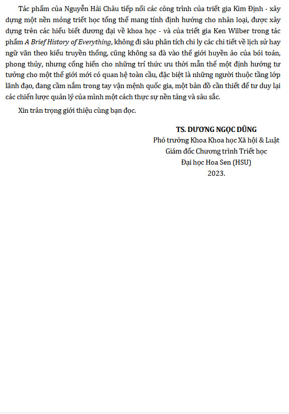 Tác phẩm của Nguyễn Hải Châu tiếp nối các công trình của triết gia Kim Định - xây dựng một nền móng triết học tổng thể mang tính định hướng cho nhân loại, được xây dựng trên các hiểu biết đương đại về khoa học - và của triết gia Ken Wilber trong tác phẩm A Brief History of Everything, không đi sâu phân tích chi ly các chi tiết về lịch sử hay ngữ văn theo kiểu truyền thống, cũng không sa đà vào thế giới huyền ảo của bói toán, phong thủy, nhưng cống hiến cho những trí thức ưu thời mẫn thế một định hướng tư tưởng cho một thế giới mới có quan hệ toàn cầu, đặc biệt là những người thuộc tầng lớp lãnh đạo, đang cầm nắm trong tay vận mệnh quốc gia, một bản đồ cần thiết để tư duy lại các chiến lược quản lý của mình một cách thực sự nền tảng và sâu sắc.
