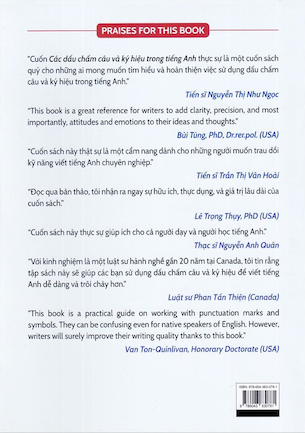 “Với kinh nghiệm là một luật sư hành nghề gần 20 năm tại Canada, tôi tin rằng tập sách này sẽ giúp các bạn sử dụng dấu chấm câu và ký hiệu để viết tiếng Anh dễ dàng và trôi chảy hơn” - Luật sư Phan Tấn Thiện (Canada)