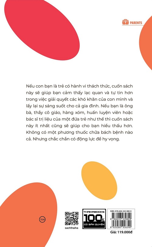 Nếu con bạn là trẻ có các hành vi cáu giận, khó bảo thì cuốn sách này sẽ giúp bạn cảm thấy lạc quan và tự tin hơn trong việc giải quyết các khó khăn của con mình và lấy lại sự sáng suốt cho cả gia đình. Nếu bạn là ông bà, thầy cô giáo, hàng xóm, huấn luyện viên hoặc bác sĩ trị liệu của một đứa trẻ như thế thì cuốn sách này ít nhất cũng sẽ giúp cho bạn hiểu thấu hơn. Không có một phương thuốc chữa bách bệnh nào cả. Nhưng chắc chắn có động lực để hy vọng.