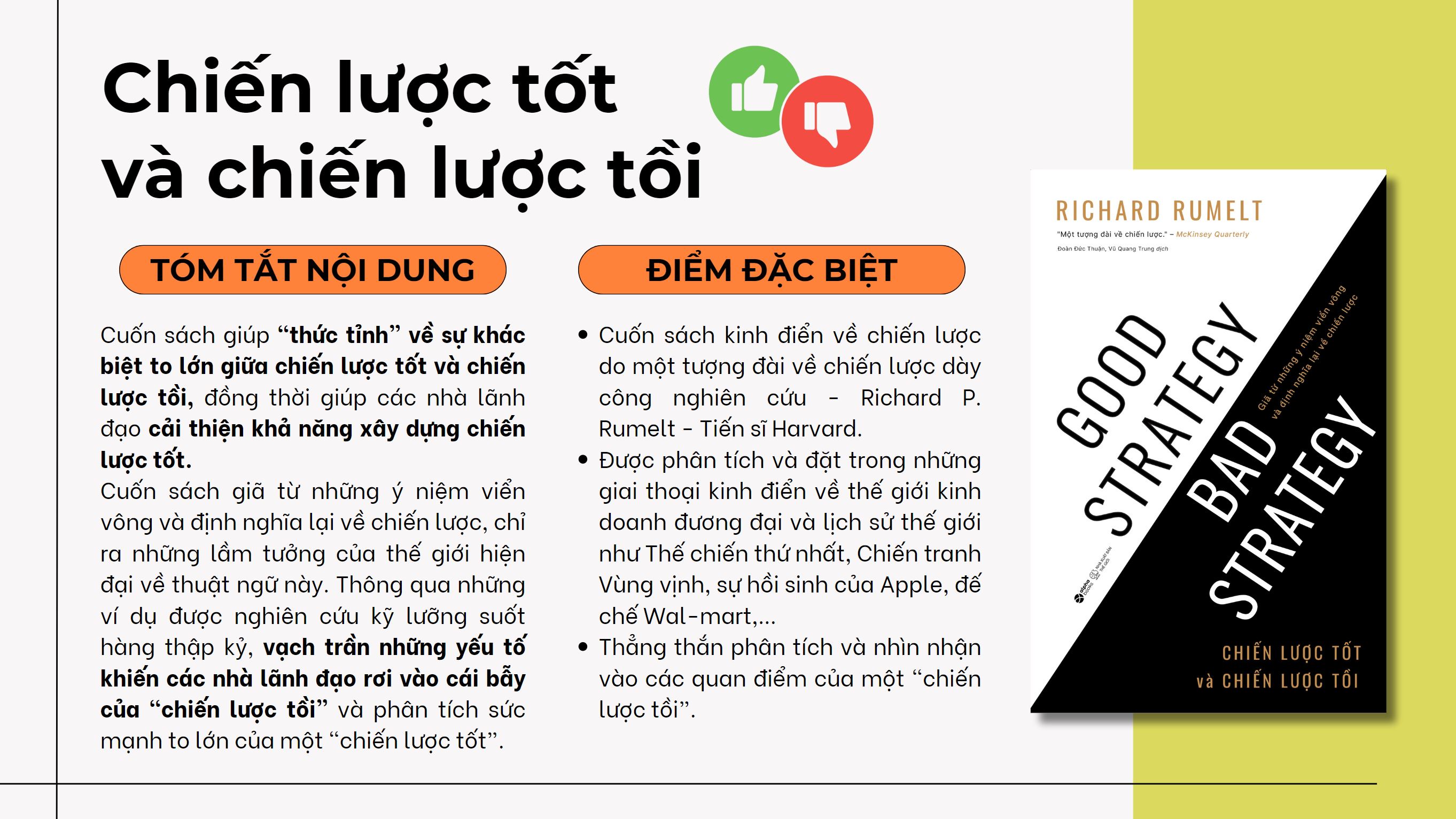 Trong Chiến Lược Tốt và Chiến Lược Tồi, Richard Rumelt đã định nghĩa một cách chính xác về “chiến lược”, chỉ ra những lầm tưởng của thế giới hiện đại về thuật ngữ đang được sử dụng một cách bừa bãi này. Thông qua những ví dụ được nghiên cứu kỹ lưỡng suốt hàng thập kỷ, từ câu chuyện của Apple, Wal-Mart, General Motors đến cuộc khủng hoảng tài chính 2008, Chiến tranh Vùng vịnh hay Thế chiến thứ nhất,... ông vạch trần những yếu tố khiến các nhà lãnh đạo rơi vào cái bẫy của “chiến lược tồi” và phân tích sức mạnh to lớn của một “chiến lược tốt”.