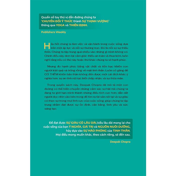 Trong quyển sách Thịnh Vượng - Abundance, Deepak Chopra đã mô tả một con đường có thể biến chuyển những cảm xúc sợ hãi mà chúng ta đang tự giới hạn mình thành những điều tích cực hơn; dẫn dắt người đọc nhìn vào bên trong để tìm ra tài sản nội tại và sự giàu có thực sự trong mọi lĩnh vực của cuộc sống; giúp chúng ta tập trung nhằm đạt được sự ổn định, cân bằng, tình yêu và sức sáng tạo.