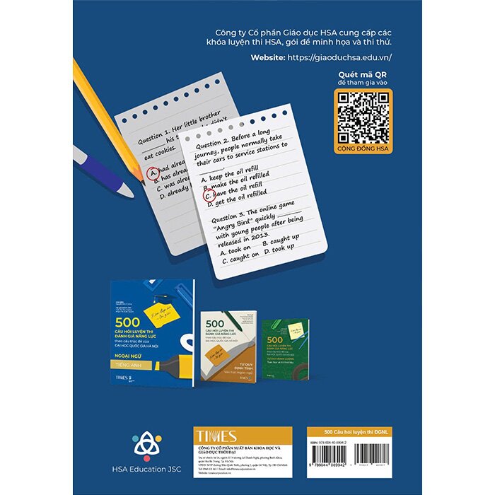 Cuốn sách 500 câu hỏi luyện thi đánh giá năng lực - Theo cấu trúc đề của Đại học quốc gia hà nội - Ngoại ngữ-Tiếng Anh được biên soạn nhằm giúp học sinh làm quen với cấu trúc và dạng thức đề thi, đồng thời nâng cao năng lực tiếng Anh một cách toàn diện. Thông qua hệ thống đề luyện phong phú, sát với thực tế, học sinh có thể tự đánh giá năng lực bản thân, xác định điểm mạnh, điểm yếu và có định hướng học tập hiệu quả hơn.