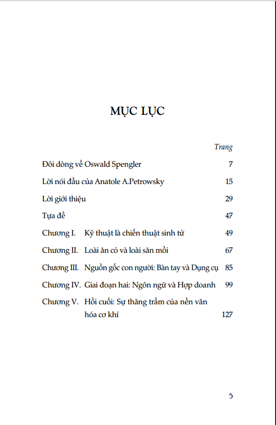 Sở dĩ hôm nay chúng tôi nhận thấy đến lúc cần mang công trình của Spengler ra cống hiến các bạn độc giả, chính là vì công trình ấy, chẳng những đã không phai mòn với thời gian, mà lúc nào cũng vẫn hợp thời, cũng vẫn linh động và chắc chắn sẽ còn hợp thời, còn linh động dài lâu. Thật vậy, cuốn CON NGƯỜI VÀ KỸ THUẬT làm nổi bật cái đức tính đặc thù của Spengler là phối hợp hai yếu tố có giá trị ngang nhau một cách không phân biệt. Một đằng là phạm vi giá trị rộng lớn thường thiết của một công trình với những viễn cảnh hết sức bao quát. Một đằng là ảnh hưởng tức tốc và rúng động của một quan điểm không những thức thời hơn cả mà còn liên hệ mật thiết hơn cả với các nghi vấn cùng các vấn đề được đặt ra trên mọi bình diện của thời đại chúng ta. Minh bạch, sâu sắc và mang tính gợi mở cao, công trình góp phần giải thích đời sống này tự nó chả [chẳng] cần gì phải giới thiệu, chả cần phải phẩm bình mà nó tự nói cho nó cũng đủ lắm rồi.