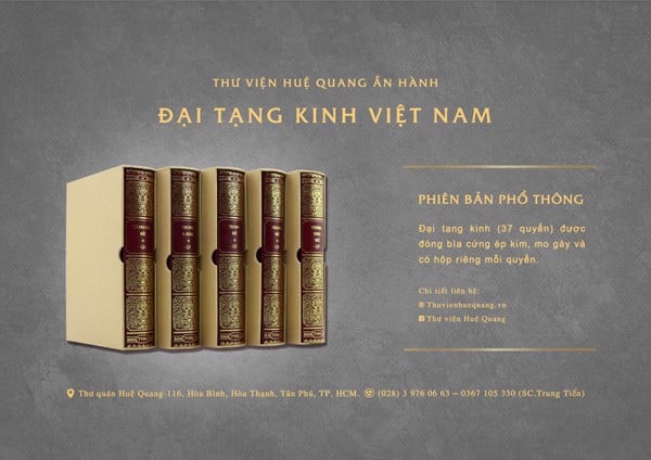 Với nỗ lực đưa Đại tạng kinh đến với độc giả bằng hình thức chỉn chu, trang trọng nhất, Thư viện Huệ Quang xin trân trọng giới thiệu bộ Đại tạng kinh Việt Nam - phiên bản 2020. Chúng tôi ảnh ấn lại bản in cũ đã được ấn hành cách đây gần 30 năm, vì đây là bản in khổ nhỏ, chữ to rất thuận tiện cho việc đọc và trì tụng. Ở phiên bản 2020 này, ruột sách được in trên giấy ford Nhật định lượng 72 gsm, bìa sách được bọc bằng giấy giả da cao cấp nhập khẩu trực tiếp từ châu Âu, ép kim bản đồng sắc nét, gáy mo tròn... Đặc biệt, mỗi cuốn kinh sẽ có hộp cứng bảo vệ bên ngoài.
