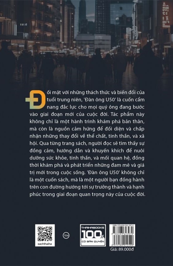Đàn ông U50 là cuốn cẩm nang đắc lực cho mọi quý ông đang bước vào giai đoạn mới của cuộc đời – tuổi trung niên với đầy những thách thức và biến đổi. Tác phẩm này không chỉ là hành trình giúp người đọc khám phá bản thân, mà còn là nguồn cảm hứng để người đọc đối diện và chấp nhận những thay dổi về thể chất, tinh thần và xã hội. Qua từng trang sách, người đọc sẽ tìm thấy sự đồng cảm, hướng dẫn và khuyến khích để nuôi dưỡng sức khoẻ, tinh thần và mối quan hệ, đồng thời khám phá và phát triển những đam mê và giá trị mới trong cuộc sống. Không chỉ là một cuốn sách, Đàn ông U50 còn là một người bạn đồng hành của các quý ông trên con đường hướng tới sự trưởng thành và hạnh phúc trong giai đoạn quan trọng này của cuộc đời.