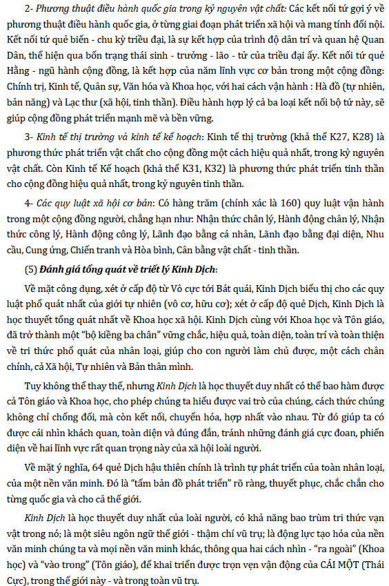 (4) Đánh giá tổng quát về triết lý Kinh Dịch: Về mặt công dụng, xét ở cấp độ từ Vô cực tới Bát quái, Kinh Dịch biểu thị cho các quy luật phổ quát nhất của giới tự nhiên (vô cơ, hữu cơ); xét ở cấp độ quẻ Dịch, Kinh Dịch là học thuyết tổng quát nhất về Khoa học xã hội. Kinh Dịch cùng với Khoa học và Tôn giáo, đã trở thành một “bộ kiềng ba chân” vững chắc, hiệu quả, toàn diện, toàn trí và toàn thiện về tri thức phổ quát của nhân loại, giúp cho con người làm chủ được, một cách chân chính, cả Xã hội, Tự nhiên và Bản thân mình.