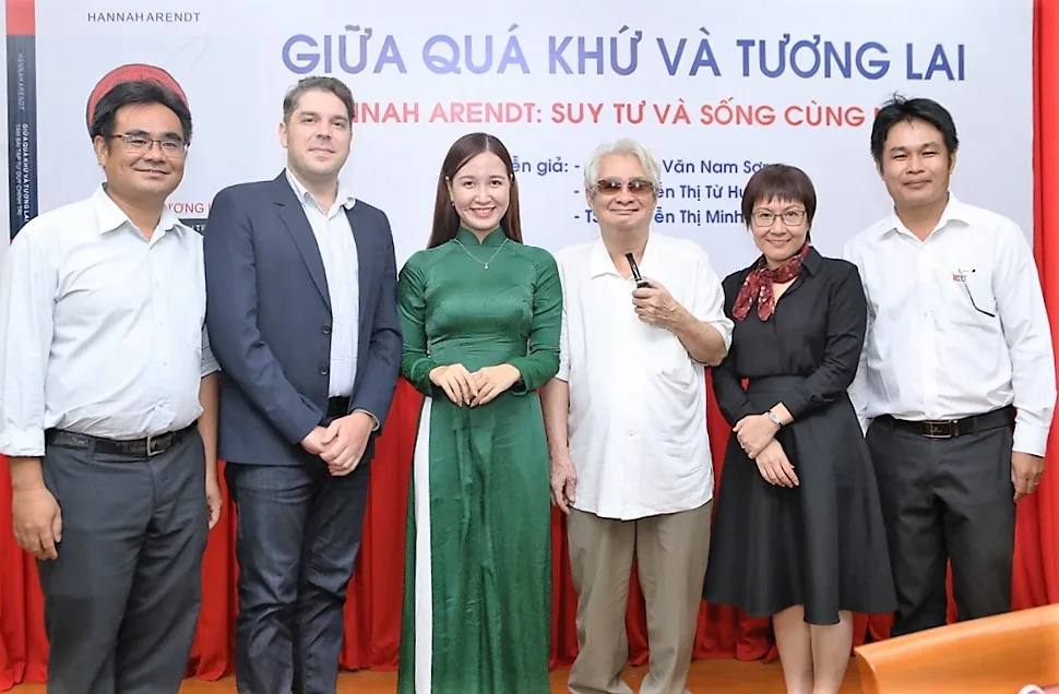 Buổi giới thiệu sách "Giữa quá khứ và tương lai". (Từ trái sang) PGS.TS Nguyễn Đức Lộc – Viện trưởng Viện Social Life, Mr.Mpangi Otte – Viện trưởng Viện Goethe (Nhà tài trợ), MC-BTV Hoài Thư, Nhà nghiên cứu Bùi Văn Nam Sơn, TS.Nguyễn Thị Từ Huy, ThS.Nguyễn Văn San. Ảnh: https://tbd.edu.vn/