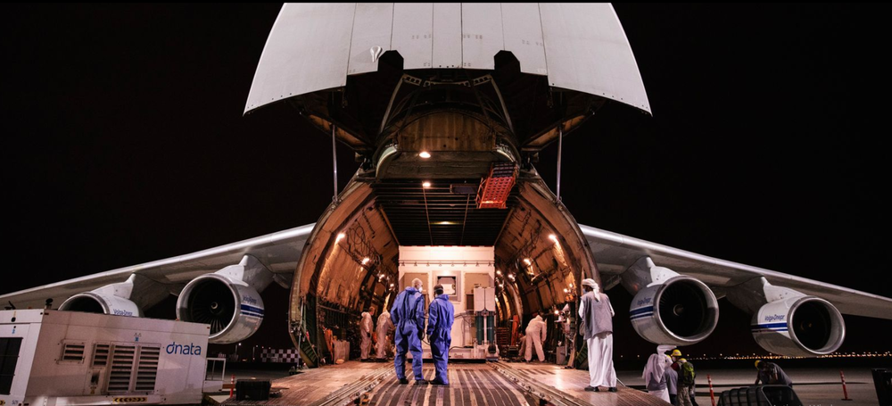 Tàu vũ trụ Hi vọng được đưa lên một máy bay chở hàng vào tháng 4 vừa qua để chuyển đến Trung tâm Vũ trụ Tanegashima, Nhật Bản. Nguồn: MBRSC.