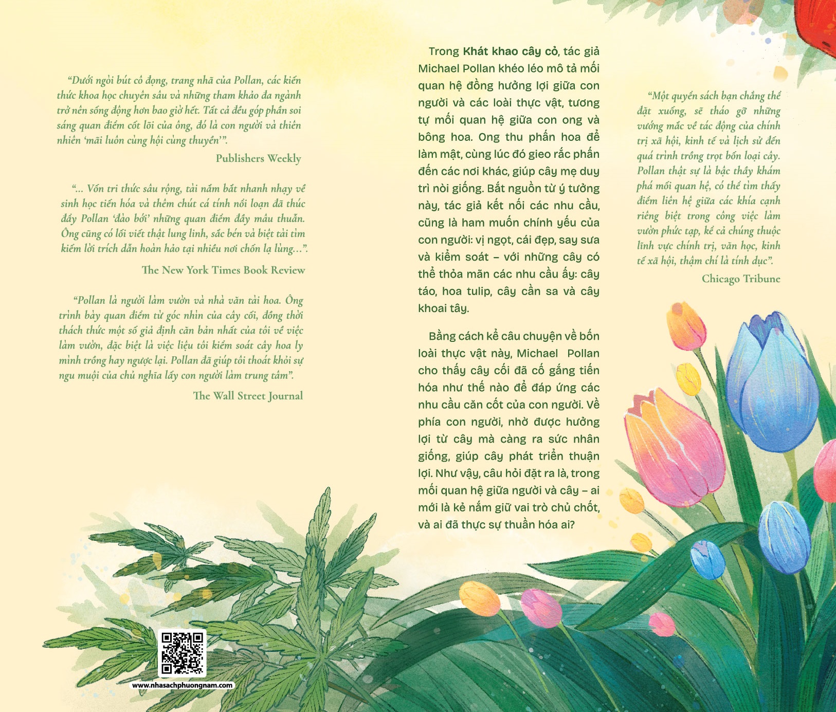 Trong Khát khao cây cỏ, tác giả Michael Pollan khéo léo mô tả mối quan hệ đồng hưởng lợi giữa con người và các loài thực vật, tương tự mối quan hệ giữa con ong và bông hoa. Ong thu phấn hoa để làm mật, cùng lúc đó gieo rắc phấn đến các nơi khác, giúp cây mẹ duy trì nòi giống. Bắt nguồn từ ý tưởng này, tác giả kết nối các nhu cầu, cũng là ham muốn chính yếu của con người: vị ngọt, cái đẹp, say sưa và kiểm soát – với những cây có thể thỏa mãn các nhu cầu ấy: cây táo, hoa tulip, cây cần sa và cây khoai tây.