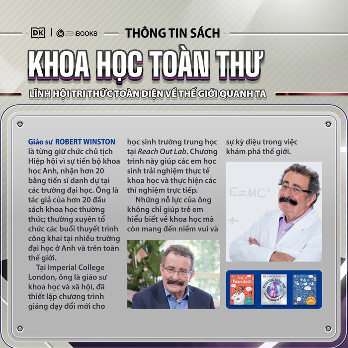 “Khoa Học Toàn Thư” nằm trong series các cuốn sách tranh khoa học - lịch sử - văn hoá được Zenbooks chuyển ngữ từ ấn bản của nhà xuất bản DK (Dorling Kindersley Limited), Anh Quốc.