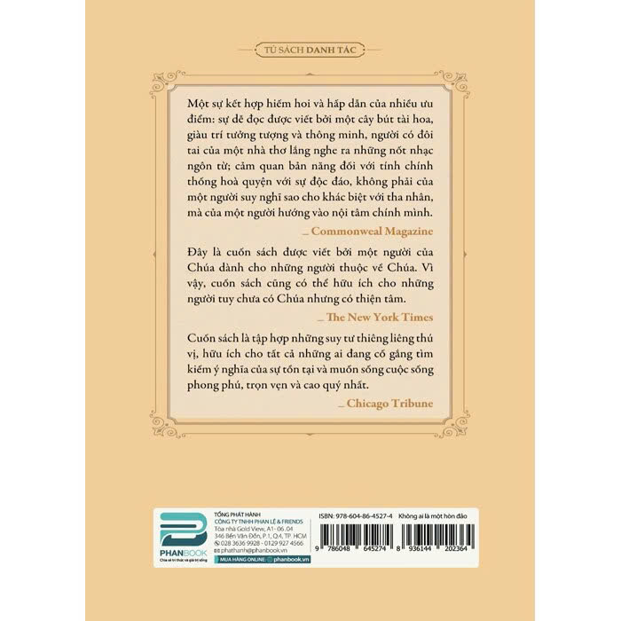 KHÔNG AI LÀ MỘT HÒN ĐẢO (tác giả Thomas Merton) là tập hợp những suy tư thiêng liêng thú vị, hữu ích cho tất cả những ai đang cố gắng tìm kiếm ý nghĩa của sự tồn tại và muốn sống cuộc sống phong phú, trọn vẹn và cao quý nhất.