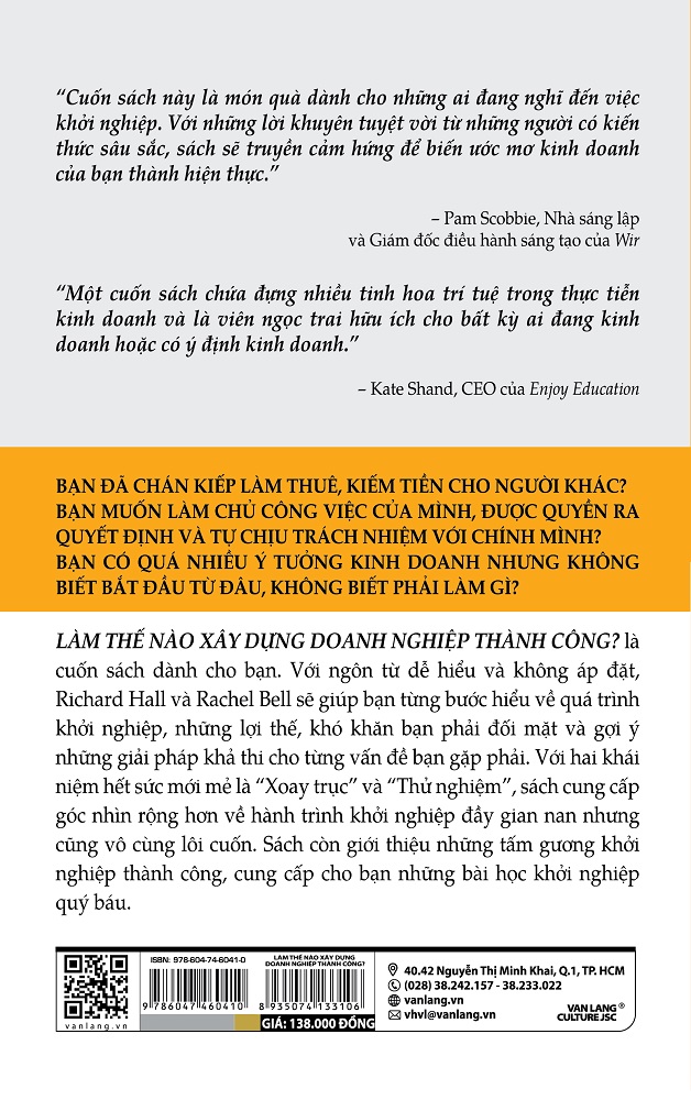 LÀM THẾ NÀO XÂY DỰNG DOANH NGHIỆP THÀNH CÔNG? là cuốn sách dành cho bạn. Với ngôn từ dễ hiểu và không áp đặt, Richard Hall và Rachel Bell sẽ giúp bạn từng bước hiểu về quá trình khởi nghiệp, những lợi thế, khó khăn bạn phải đối mặt và gợi ý những giải pháp khả thi cho từng vấn đề bạn gặp phải. Với hai khái niệm hết sức mới mẻ là “Xoay trục” và “Thử nghiệm”, sách cung cấp góc nhìn rộng hơn về hành trình khởi nghiệp đầy gian nan nhưng cũng vô cùng lôi cuốn. Sách còn giới thiệu những tấm gương khởi nghiệp thành công, cung cấp cho bạn những bài học khởi nghiệp quý báu.