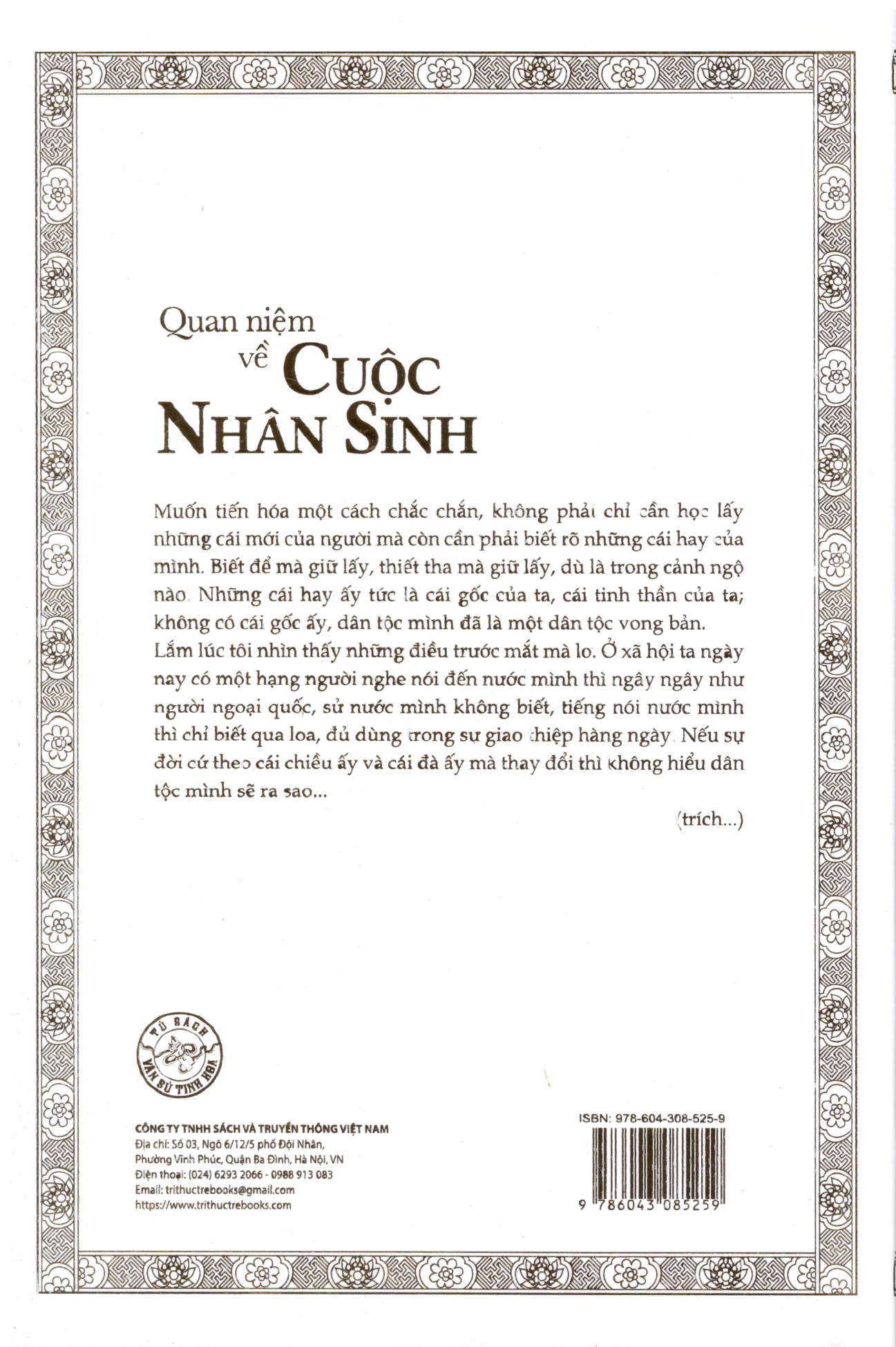 Quan niệm về cuộc nhân sinh là một cuốn sách tổng hợp những bài phỏng vấn cũng như diễn thuyết của tác giả Trần Trọng Kim. Tựa đề cuốn sách được lấy tên từ chính bài diễn thuyết của cụ tại Hội Trí Tri Nam Định năm 1936. Là một tác gia, một chính khách bất đắc dĩ, một nhà sử học, một nhà dân tộc học nhưng dường như, hành trang của cụ được quá ít người nhắc đến.