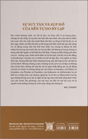 Văn minh Hy Lạp suy tàn, nhưng những kiến thức, bài học lịch sử để lại sẽ mãi là nguồn tri thức vô giá; những cái tên như Plato và Aristotle, Apelles và Praxiteles, Philip và Demosthenes, Diogenes và Alexander sẽ mãi tồn tại. Văn minh không chết, nó chỉ di tản, nó thay chỗ ở và trang phục, nhưng nó vẫn sống. Sự suy tàn của một nền văn minh, như của một cá nhân, sửa soạn chỗ cho một văn minh khác lớn lên; sự sống rũ bỏ bộ da cũ, và làm ngạc nhiên sự chết với một sự trẻ trung mới. Văn minh Hy Lạp vẫn cử động trong mỗi hơi thở tinh thần mà chúng ta đang hít thở; nhiều thứ trong văn minh đó còn lưu lại đến nỗi không ai trong chúng ta trong một đời người có thể hấp thu hết được.