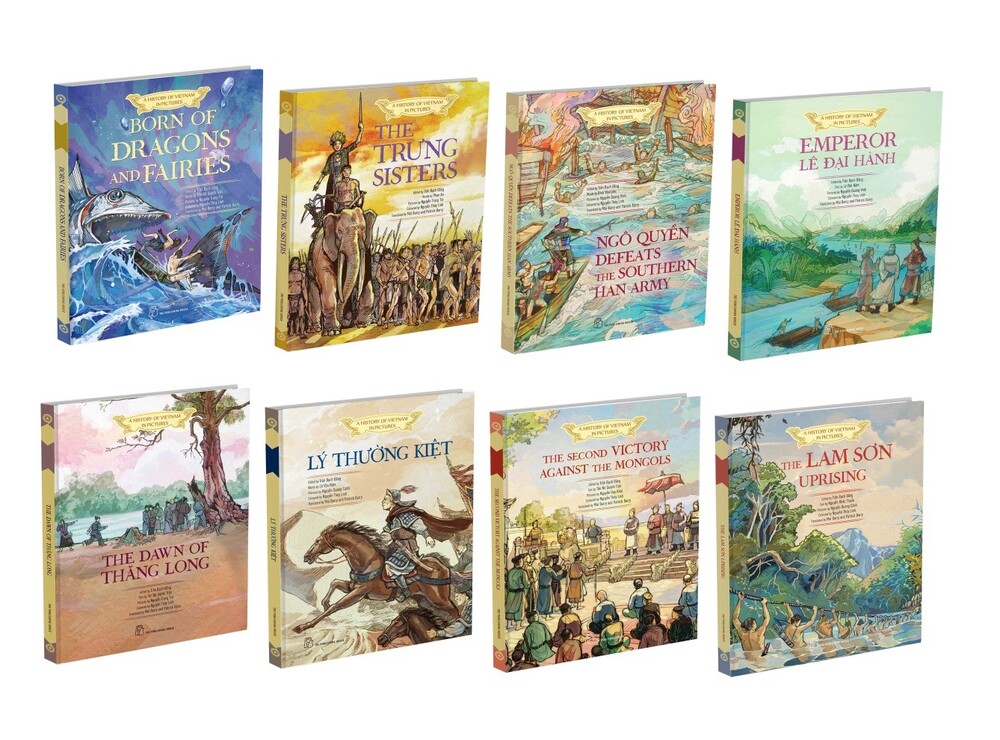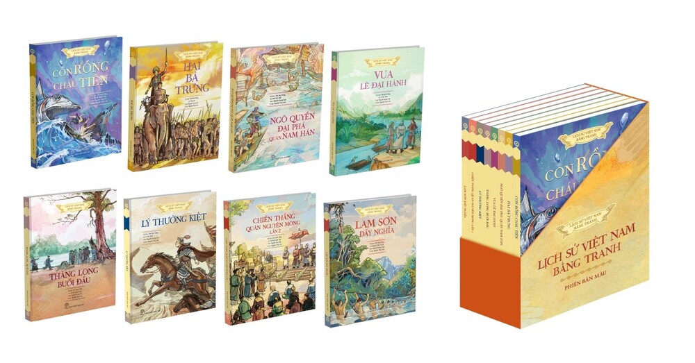 Trong lần thực hiện phiên bản màu đầu tiên này, Nhà xuất bản Trẻ giới thiệu đến Quý vị 8 cuốn Lịch sử Việt Nam bằng tranh phiên bản màu – bìa cứng với ngôn ngữ tiếng Việt và tiếng Anh.