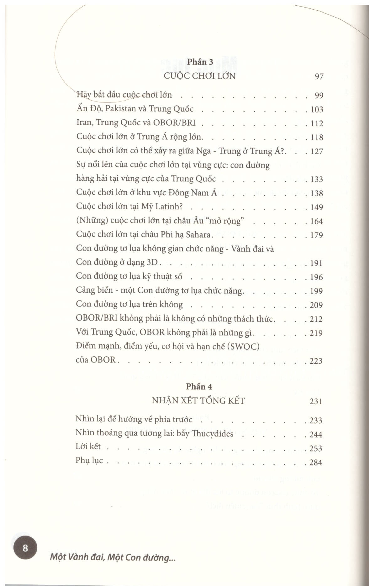 Cuốn sách có cái nhìn tổng quát về sự hình thành , phát triển và những tác động của Sáng kiến Vành đai và Con dường trên các mặt kinh tế, chính trị, quan hệ quốc tế, xã hội, khoa học công nghệ… đã diễn ra trong thực tế trên phạm vi toàn cầu từ năm 2013 đến nay.