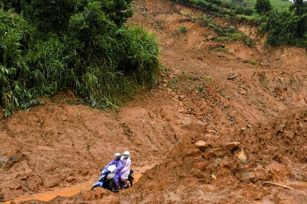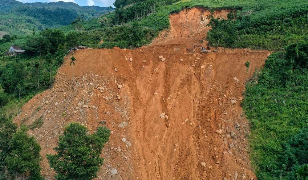 Mưa lớn kéo dài những ngày giữa tháng 10.2020 đã khiến đồi Le Ngói sạt lở, uy hiếp tính mạng người dân ở thôn Ra Pân, xã Sơn Long, huyện Sơn Tây, tỉnh Quảng Ngãi. Ông Đỗ Thanh Vượt, Chủ tịch UBND xã Sơn Long cho biết đây là lần đầu tiên mưa lũ gây sạt trượt cả một quả đồi rộng lớn khiến khoảng 23.000 m3 đất, đá tràn xuống làng… Ảnh: Zing