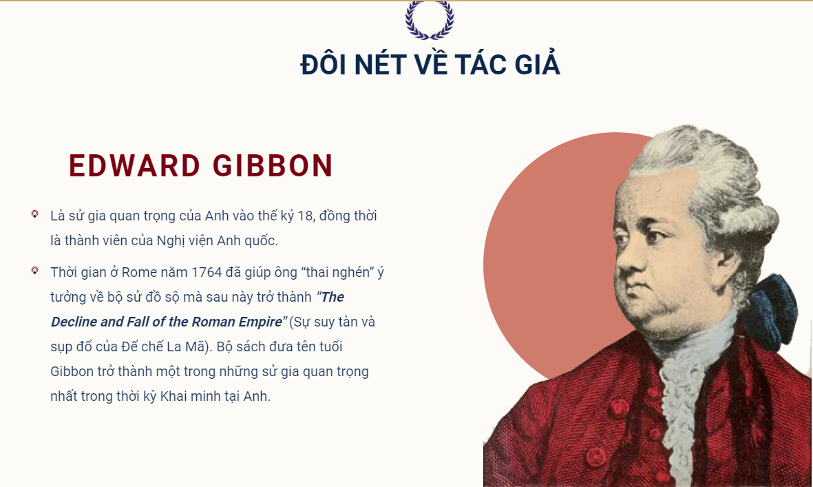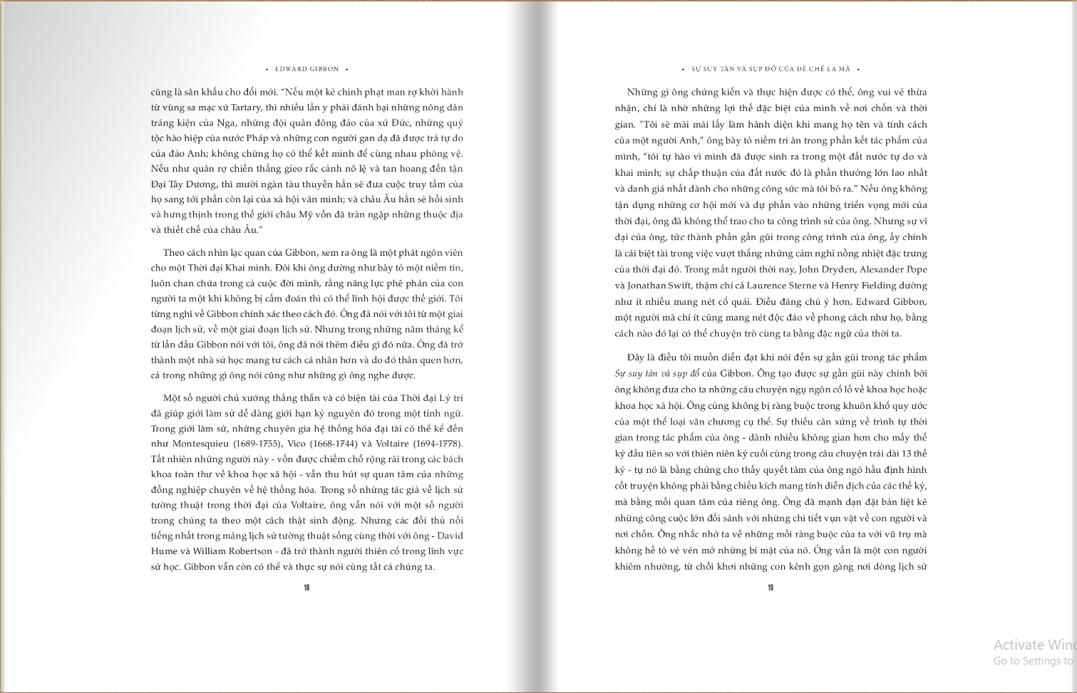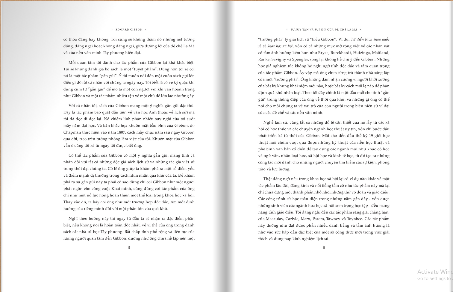 Trong Lời giới thiệu, nhà sử học Daniel J. Boorstin nhấn mạnh “tính gần gũi” của Gibbon, xem đây là lý do Gibbon vẫn còn hoài sinh động, dù đã cách nay hơn 200 năm. Quả thật, ông là một trường hợp độc đáo, nơi văn chương và học thuật hòa quyện, nơi cái chất chơi và tác phong chuyên nghiệp song hành, và nơi giá trị khai trí dẫy đầy trong tình tiết giải trí. Thiết nghĩ, bấy nhiêu cũng tạm đủ để trả lời cho câu hỏi "Tại sao vẫn cần dịch Gibbon?" - Thanh Khê