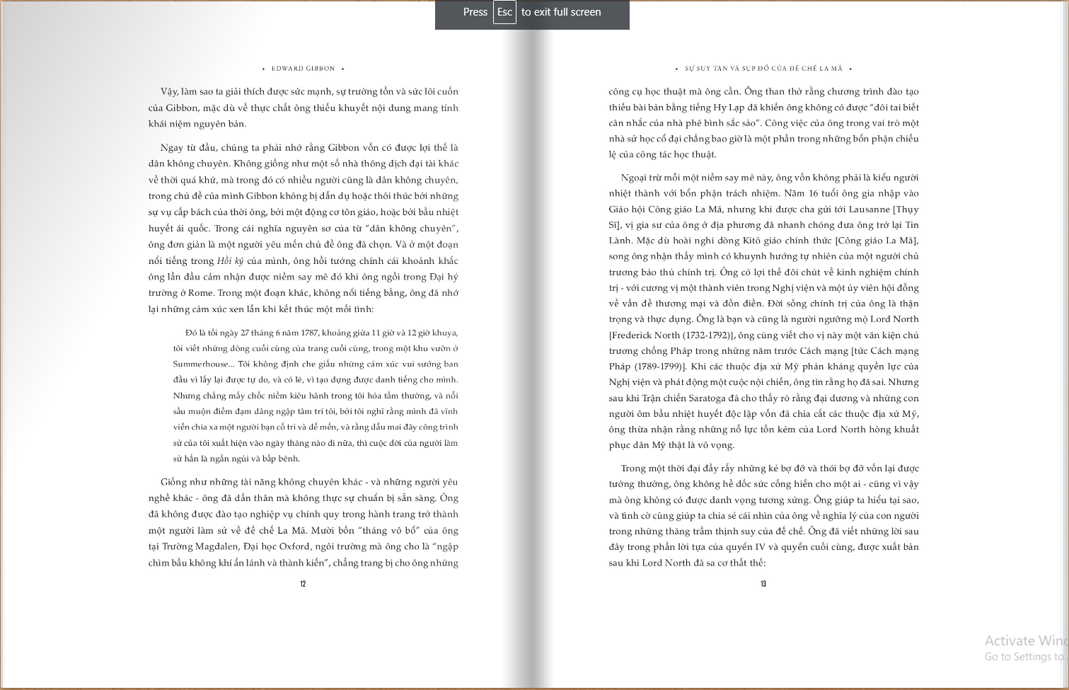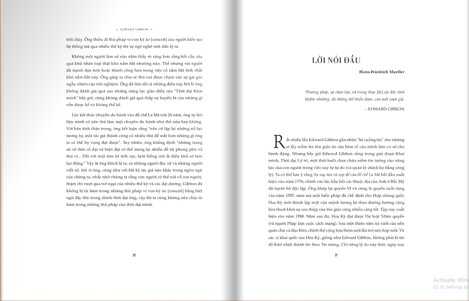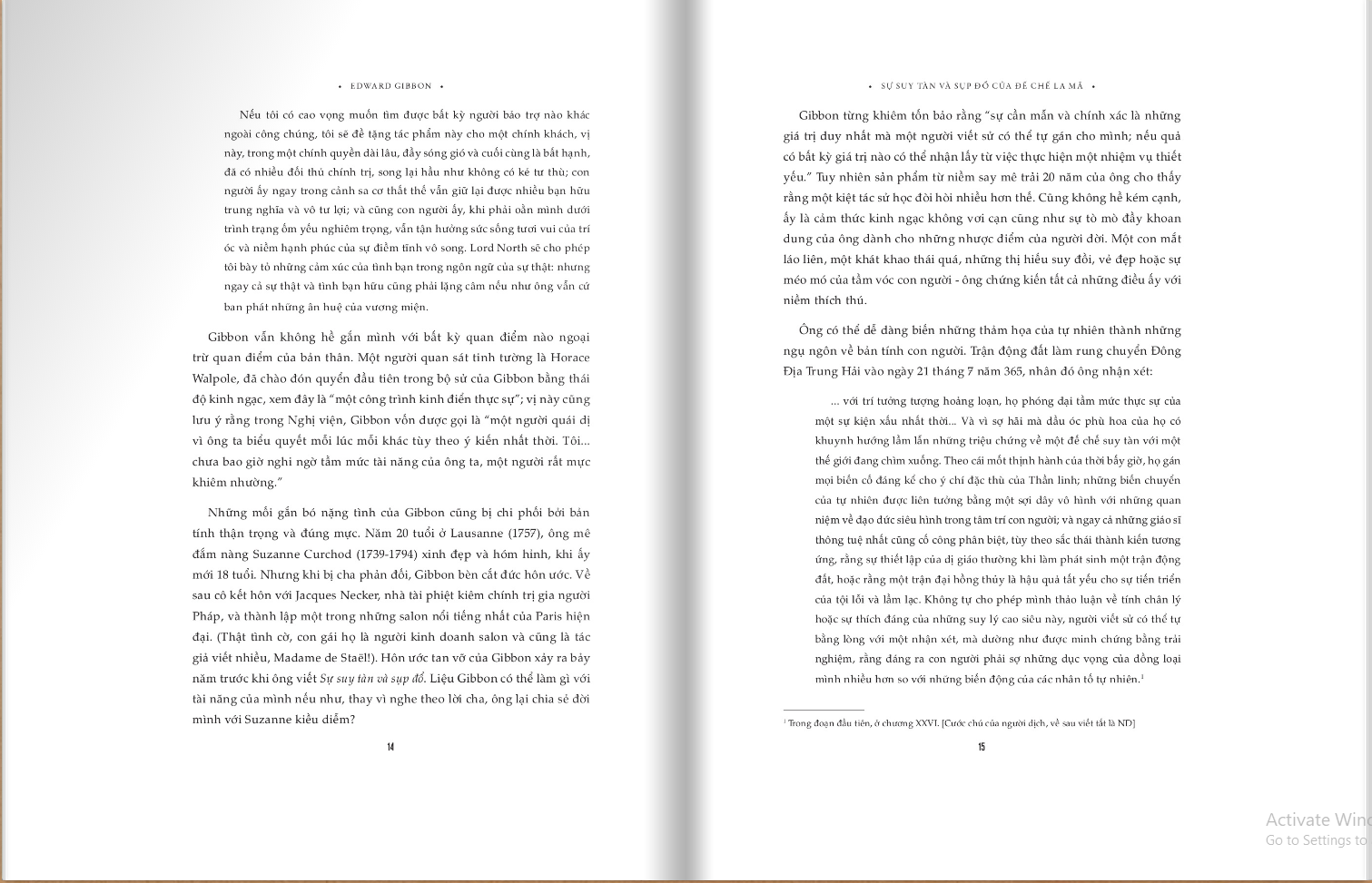 Trong Lời giới thiệu, nhà sử học Daniel J. Boorstin nhấn mạnh “tính gần gũi” của Gibbon, xem đây là lý do Gibbon vẫn còn hoài sinh động, dù đã cách nay hơn 200 năm. Quả thật, ông là một trường hợp độc đáo, nơi văn chương và học thuật hòa quyện, nơi cái chất chơi và tác phong chuyên nghiệp song hành, và nơi giá trị khai trí dẫy đầy trong tình tiết giải trí. Thiết nghĩ, bấy nhiêu cũng tạm đủ để trả lời cho câu hỏi "Tại sao vẫn cần dịch Gibbon?" - Thanh Khê