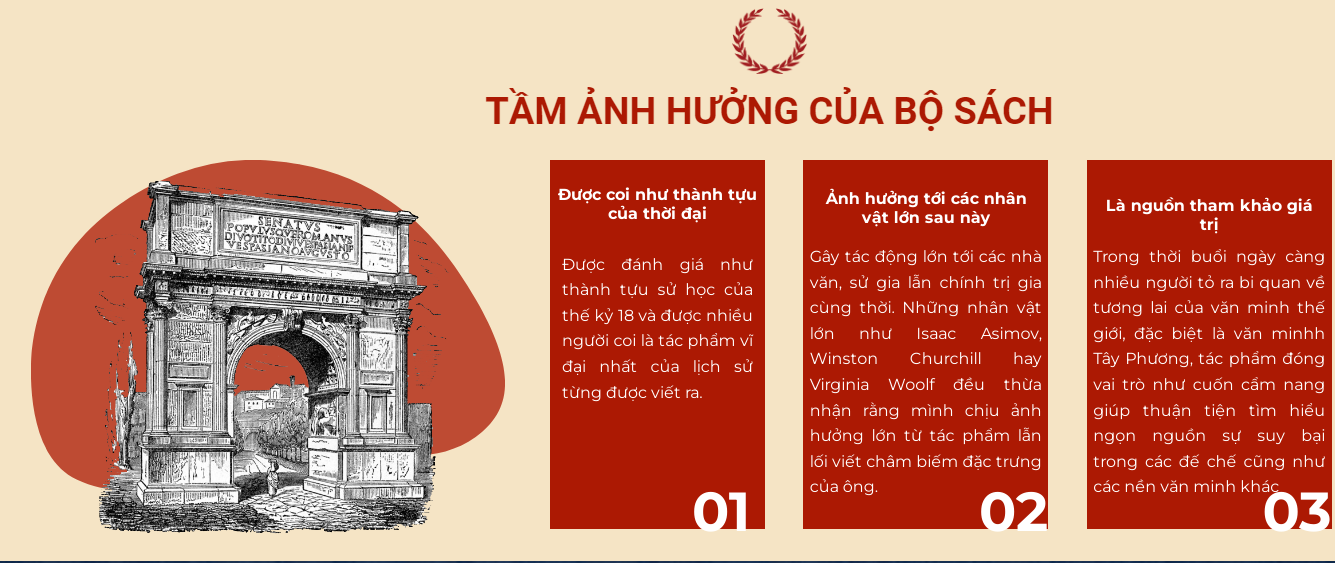 “Nói về một hành trình dài nhường ấy thì biết bao nhiêu cho đủ. Đã đến lúc kết lại bằng mấy lời. Dù bạn có đồng ý đến đâu với "các nguyên nhân" mà Gibbon đúc kết, lợi ích thu được từ tác phẩm này thật rõ ràng. Hơn một ngàn trang sách cũng không phải là quá đáng đối với một công trình bao trọn 13 thế kỷ văn minh La Mã, và không chỉ nói về La Mã. Gibbon chủ yếu tập trung ở đế chế phương Tây, dù đúng là ông có lần theo tàn dư của danh xưng La Mã cho đến ngày Constantinople thất thủ lần sau cuối (1453).