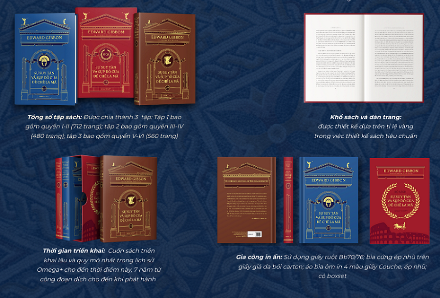 Gia công in ấn: Sử dụng giấy ruột Bb70/76; bìa cứng ép nhũ trên giấy giả da bồi carton; áo bìa ôm in 4 màu giấy Couche, ép nhũ; có boxset.