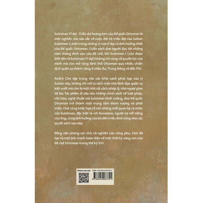 Suleiman Vĩ đại – Triều đại hoàng kim của Đế quốc Ottoman là một trong những tác phẩm lớn nghiên cứu sâu sắc về cuộc đời và triều đại của Sultan Suleiman I - một trong những vị vua vĩ đại có ảnh hưởng nhất của Đế quốc Ottoman. Cuốn sách đưa người đọc đến với năm tháng đỉnh cao của đế chế khi Suleiman củng cố quyền lực của mình và mở rộng lãnh thổ Ottoman qua nhiều chiến dịch quân sự vang dội ở châu Âu, Trung Đông và Bắc Phi.