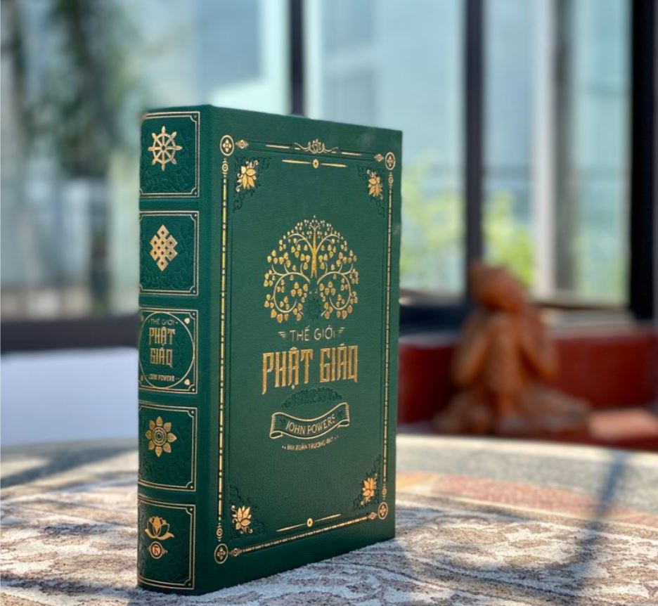 - Sách đựng trong hộp bồi thủ công trên carton 3 ly nhập khẩu, in họa tiết Phật giáo đồng bộ với tờ gác. Tên sách, tên tác giả trên hộp được ép nhũ vàng giống bìa sách.