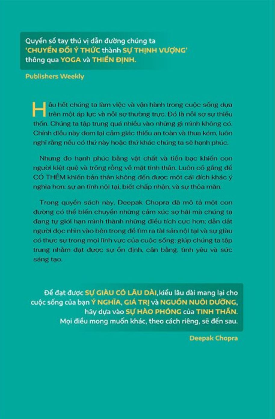 Trong quyển sách Thịnh Vượng - Abundance, Deepak Chopra đã mô tả một con đường có thể biến chuyển những cảm xúc sợ hãi mà chúng ta đang tự giới hạn mình thành những điều tích cực hơn; dẫn dắt người đọc nhìn vào bên trong để tìm ra tài sản nội tại và sự giàu có thực sự trong mọi lĩnh vực của cuộc sống; giúp chúng ta tập trung nhằm đạt được sự ổn định, cân bằng, tình yêu và sức sáng tạo.