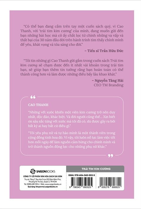 “Tôi tin những gì Cao Thanh gửi gắm trong cuốn sách Trái tim kim cương sẽ chạm được đến ít nhất vài khoản trong trái tim bạn, sẽ giúp bạn thêm tin tưởng rằng bạn hoàn toàn có thể thành công hơn và làm được những điều bấy lâu khao khát" - Nguyễn Tăng Hải, CEO TM Branding