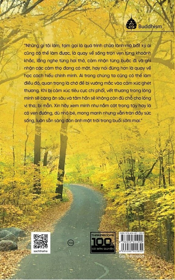 “Những gì tôi làm, tạm gọi là quá trình chữa lành mà bất kỳ ai cũng có thể làm được, là quay về sống trọn vẹn từng khoảnh khắc, lắng nghe từng hơi thở, cảm nhận từng bước đi và ghi nhận các cảm thọ đang có mặt, hay nói đúng hơn là quay về học cách hiểu chính mình. Ai trong chúng ta cũng có thể làm điều đó, quan trọng là chớ để bị vướng mắc vào cảm xúc ghét thương. Khi bị cảm xúc tiêu cực chi phối, vết thương trong lòng mình sẽ càng ăn sâu và tâm hồn sẽ không còn đủ chỗ cho lòng vị tha, bi mẫn. Xin hãy xem mình như nắm cát trong tay hay lá cỏ ven đường, dù nhỏ bé, mong manh nhưng vẫn tràn đầy sức sống, luôn sẵn sàng đón ánh mặt trời trong buổi sớm mai.”