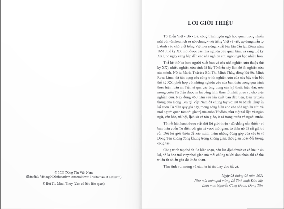 Linh mục Nguyễn Công Đoan, Dòng Tên, trong lời giới thiệu cuốn “Từ điển VIỆT - BỒ - LA và các cứ liệu liên quan” đã nhận định: “Thế hệ thứ ba (sau người xuất bản và các nhà nghiên cứu thuộc thế kỷ XX), nhiều nghiên cứu sinh đã lấy từ điển này làm đề tài nghiên cứu của mình. Nữ tu Bùi Thị Minh Thùy, dòng Nữ Đa Minh Rosa Lima, đã tận dụng các công trình nghiên cứu của các bậc tiền bối thế kỷ XX, phối hợp với những nghiên cứu của bản thân trong quá trình thực hiện luận án Tiến sĩ qua các ứng dụng của kỹ thuật hiện đại, ước mong cuốn Từ điển được in lại bằng hình thức tốt nhất phục vụ cho việc nghiên cứu. Nay đúng 370 năm sau lần xuất bản đầu tiên, Ban Truyền thông của Dòng Tên tại Việt Nam đã chung tay với nữ tu Minh Thùy, in lại cuốn từ điển quý giá này, mong cống hiến cho các nhà nghiên cứu và mọi người quan tâm tới giá trị của cuốn từ điển, như một tài liệu về ngôn ngữ, văn hóa, xã hội, lịch sử và tôn giáo, ở cả trong nước và ngoài nước.”
