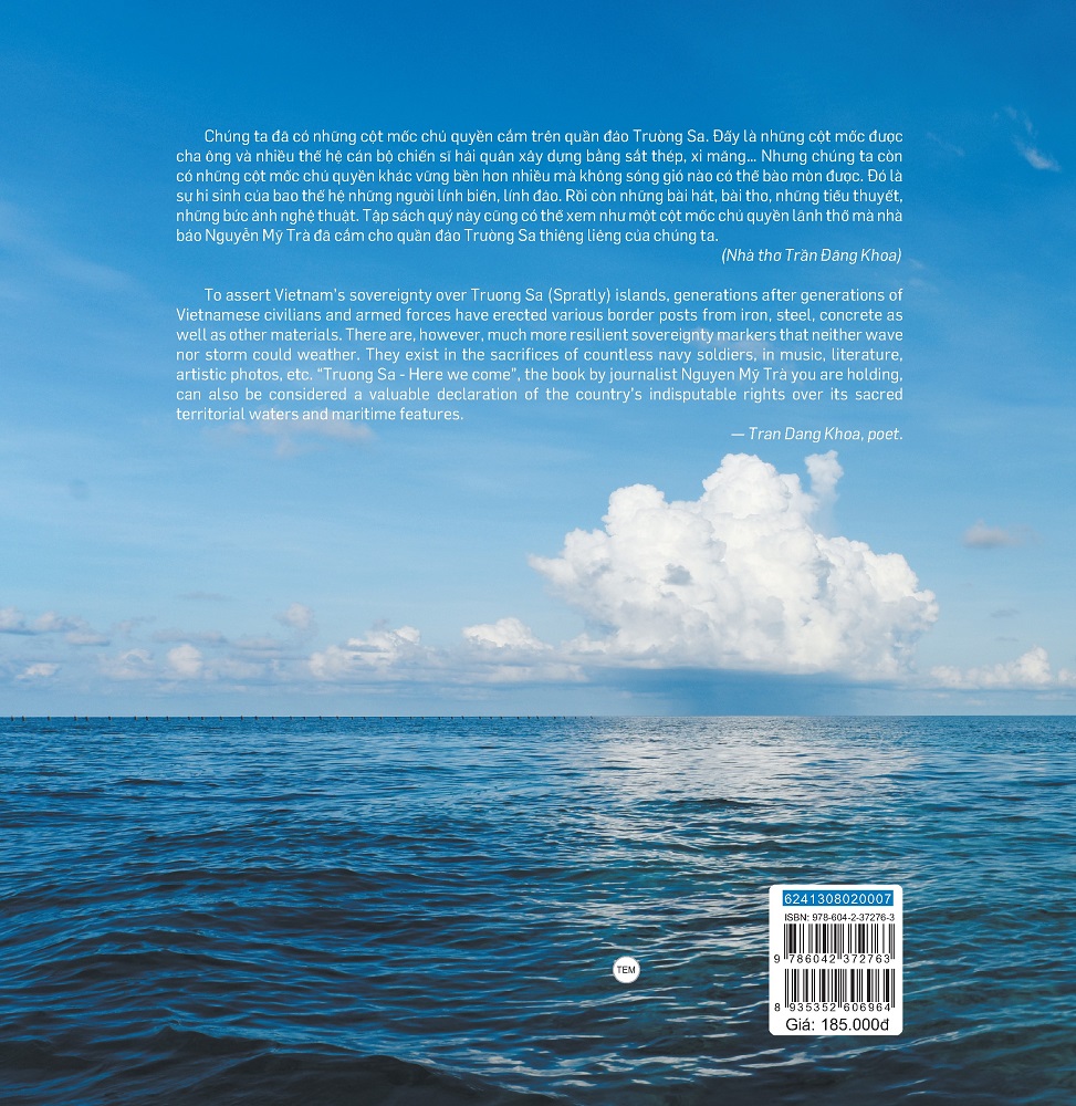 “To assert Vietnam’s sovereignty over Truong Sa (Spratly) islands, generations after generations of Vietnamese civilians and armed forces have erected various border posts from iron, steel, concrete as well as other materials. There are, however, much more resilient sovereignty markers that neither wave nor storm could weather. They exist in the sacrifices of countless navy soldiers, in music, literature, artistic photos, etc. “Truong Sa - Here we come”, the book by journalist Nguyễn Mỹ Trà you are holding, can also be considered a valuable declaration of the country’s indisputable rights over its sacred territorial waters and maritime features.” - Tran Dang Khoa, poet.