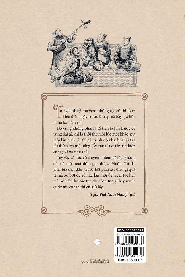 Ấn bản đầy đủ nhất của “Việt Nam phong tục” - tập khảo cứu toàn diện về phong tục, tập quán của người Việt xưa của học giả Phan Kế Bính. Tập sách có thêm phần chú giải, hiệu chỉnh giúp độc giả ngày nay có thể hiểu rõ hơn tác phẩm.