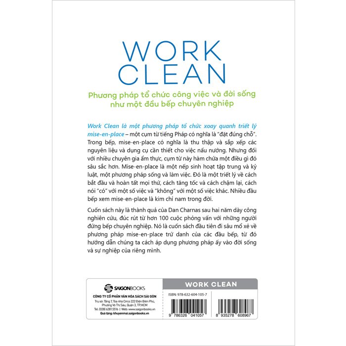 “Mise en place” là thuật ngữ quen thuộc của giới ẩm thực, có nghĩa là “sắp xếp mọi thứ đúng chỗ”. Mise en place không chỉ là một nguyên lý áp dụng trong bếp, mà còn là một triết lý sống, áp dụng vào công việc và cuộc sống hằng ngày để bạn nâng cao năng suất, giảm căng thẳng và cải thiện cuộc sống thông qua các quy tắc được tác giả Dan Charnas đúc kết và chia sẻ trong “WORK CLEAN - Phương pháp tổ chức công việc và đời sống như một đầu bếp chuyên nghiệp”.