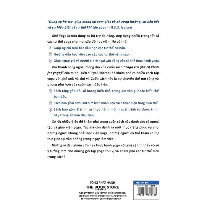 Trong quyển sách “Yoga với ghế” (Bản đầy đủ hướng dẫn thực hành toàn diện Iyengar Yoga với ghế), tác giả Eyal Shifroni đã khám phá tiềm năng vượt trội của chiếc ghế trong việc nâng cao kỹ năng thực hành asana. Dù bạn là học viên kỳ cựu hay chỉ mới bắt đầu hành trình với yoga thì chiếc ghế cũng sẽ mang đến cho bạn sự hỗ trợ tuyệt vời, cho phép bạn đi sâu vào từng tư thế và mở rộng trải nghiệm luyện tập với sự dễ chịu.