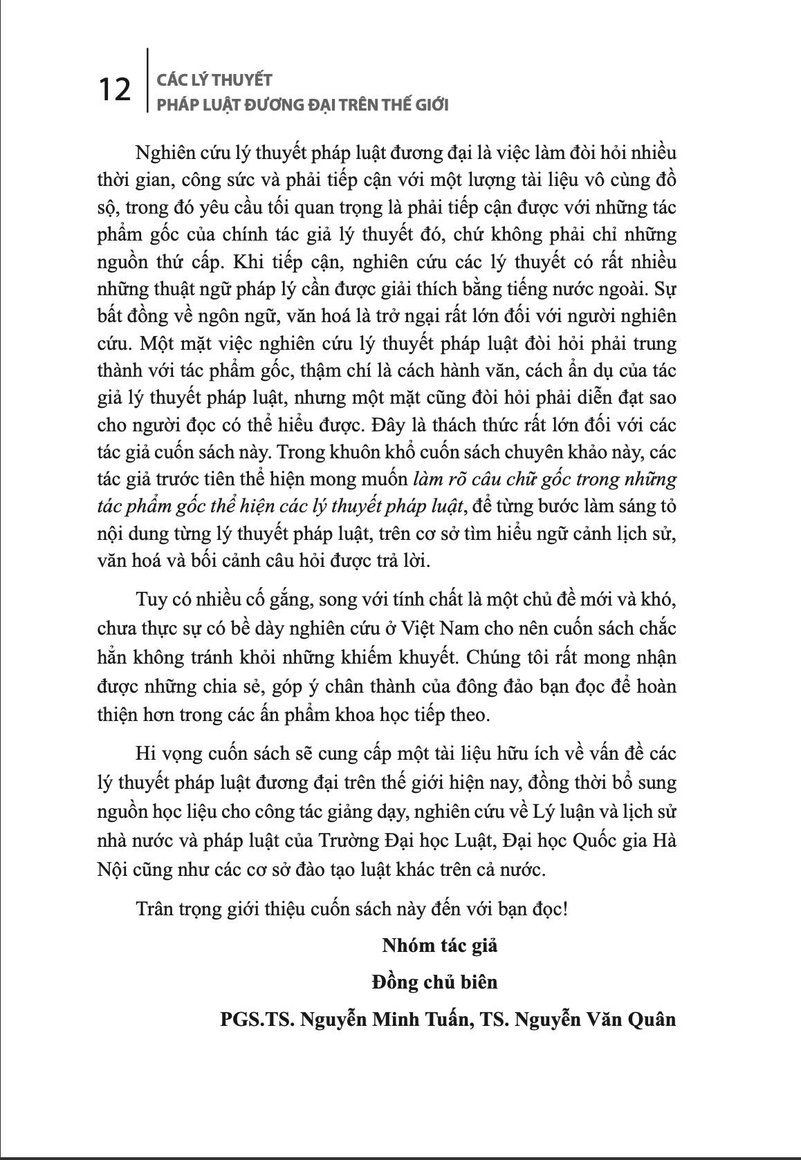 Cuốn sách này không chỉ dành cho sinh viên, học viên cao học, nghiên cứu sinh ngành luật hay những giảng viên, những nhà nghiên cứu khoa học pháp lý mà còn là cuốn sách hữu ích cho những nhà nghiên cứu khoa học xã hội, cho tất cả những ai quan tâm, muốn tìm hiểu một cách hệ thống, toàn diện về chủ đề này. Hi vọng đây sẽ là một tài liệu hữu ích đối với bạn đọc về vấn đề các lý thuyết pháp luật đương đại trên thế giới hiện nay.
