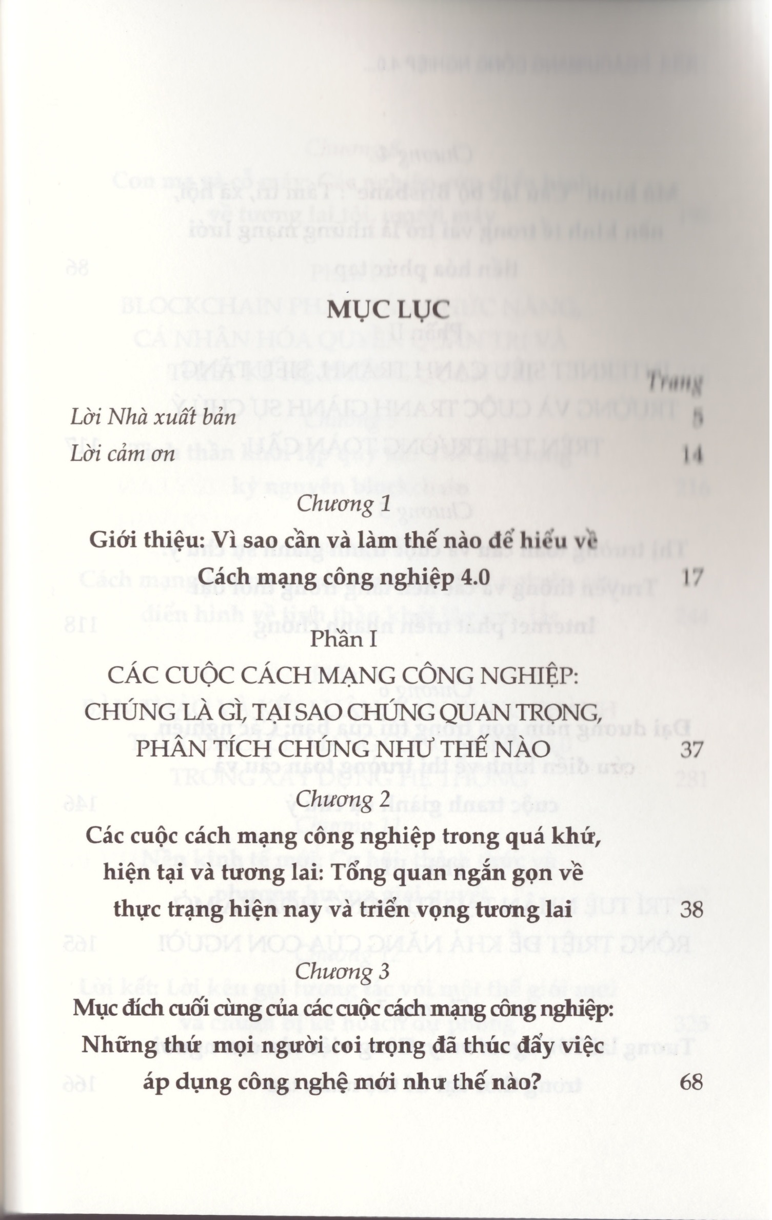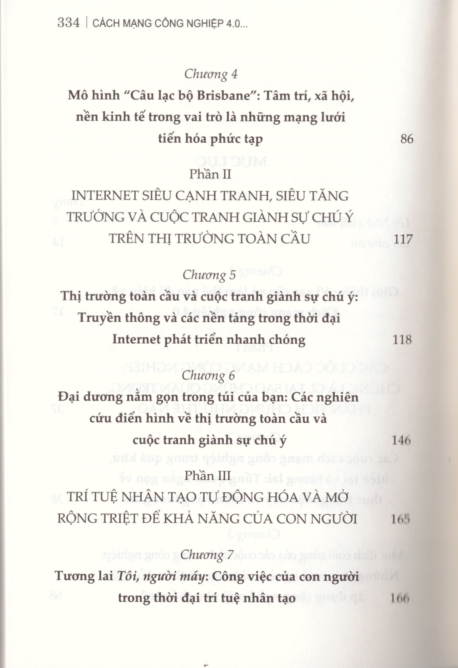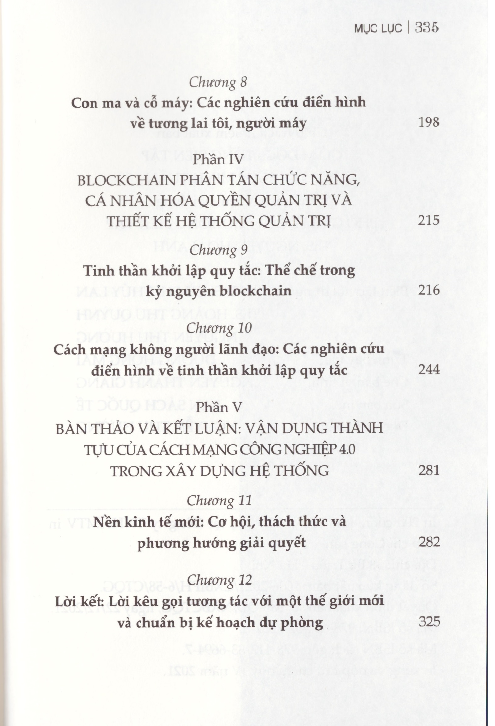 Cuốn sách được bố cục gồm 5 phần với 12 chương, tập trung làm sáng tỏ những vấn đề cốt lõi, cụ thể như sau: Phần I: Đặc điểm, tính chất và vai trò quan trọng của các cuộc cách mạng công nghiệp là gì?, tại sao chúng quan trọng, phân tích chúng như thế nào? Phần II: Internet: Siêu cạnh tranh, siêu tăng trưởng và cuộc tranh giành sự chú ý trên thị trường toàn cầu. Phần III: Trí tuệ nhân tạo: Tự động hoá và mở rộng triệt để khả năng của con người. Phần IV: Blockchain: Phân tán chức năng, cá nhân hoá quyền quản trị và thiết kế hệ thống chính trị. Phần V: Bàn thảo và kết luận: Vận dụng thành tựu của Cách mạng công nghiệp 4.0 trong xây dựng hệ thống.