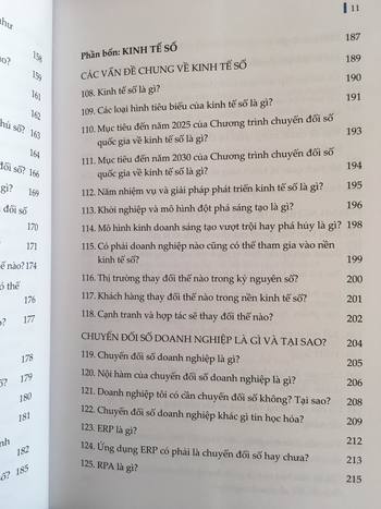 Nội dung cuốn sách được thiết kế với 200 câu hỏi - đáp, mỗi câu hỏi về một vấn đề của chuyển đổi số, và câu trả lời thường đi cùng ví dụ minh họa, với cố gắng diễn giải đơn giản nhất có thể. Các câu hỏi được chia thành bốn nhóm, gồm câu hỏi chung về chuyển đổi số, chuyển đổi số trong doanh nghiệp, chuyển đổi số trong cơ quan nhà nước, và chuyển đổi số cho mọi người. Câu hỏi trong mỗi nhóm tiếp tục được gộp theo các loại câu: “là gì”, “tại sao”, “thế nào”, “ai”, “khi nào”…