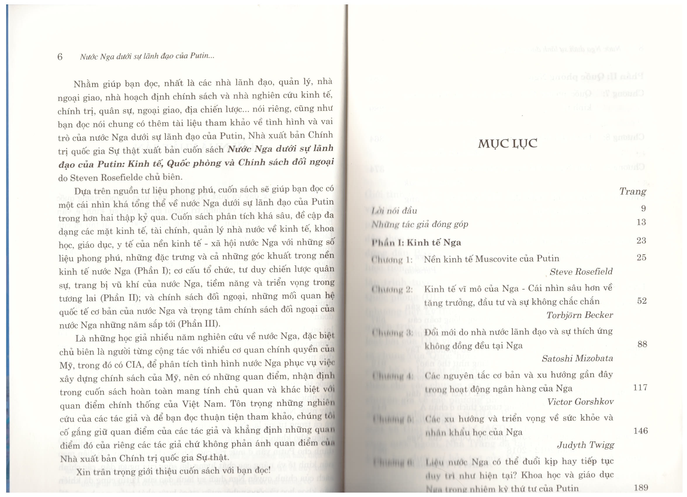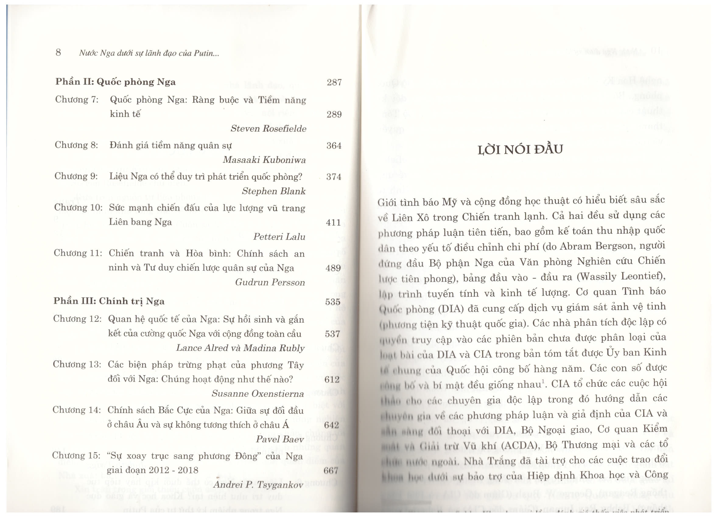 Cuốn sách sẽ giúp bạn đọc có cái nhìn khá tổng thể về nước Nga dưới sự lãnh đạo của Putin trong hơn hai thập kỷ qua. Cuốn sách phân tích khá sâu, đề cập đa dạng các mặt kinh tế, tài chính, quản lý nhà nước về kinh tế, khoa học, giáo dục, y tế của nền kinh tế – xã hội nước Nga với những số liệu phong phú, những đặc trưng và cả những góc khuất trong nền kinh tế nước Nga (Phần I); cơ cấu tổ chức, tư duy chiến lược quân sự, trang bị vũ khí của nước Nga, tiềm năng và triển vọng trong tương lai (Phần II); và chính sách đối ngoại, những mối quan hệ quốc tế cơ bản của nước Nga và trọng tâm chính sách đối ngoại của nước Nga những năm sắp tới (Phần III).
