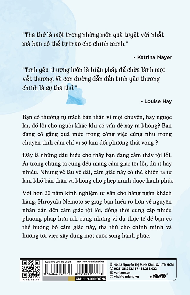 Với hơn 20 năm kinh nghiệm tư vấn cho hàng ngàn khách hàng, Hiroyuki Nemoto sẽ giúp bạn hiểu rõ hơn về nguyên nhân dẫn đến cảm giác tội lỗi, đồng thời cung cấp nhiều phương pháp hữu ích cùng những ví dụ thực tế để bạn có thể buông bỏ cảm giác này, tha thứ cho chính mình và hướng tới việc xây dựng một cuộc sống hạnh phúc