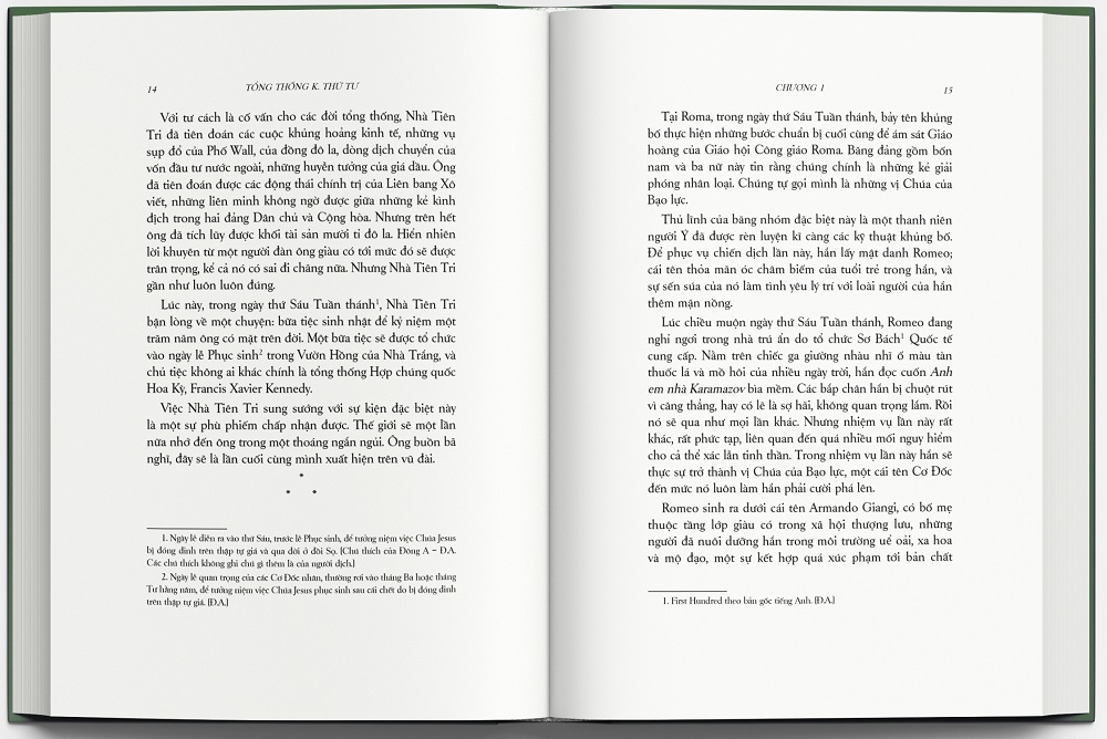 Tác giả đã đưa bạn đọc hết từ âm mưu này đến âm mưu khác, cả từ phe khủng bố lẫn chính những vị đức cao vọng trọng trong chính quyền được coi là quyền lực nhất thế giới, và cả những nhà tài phiệt đứng đằng sau nó. Đứng giữa những lựa chọn khó khăn, Francis Xavier Kennedy đã đưa ra một quyết định cực đoan mà không ai – kể cả những người thân cận nhất với ông – có thể ngờ tới.